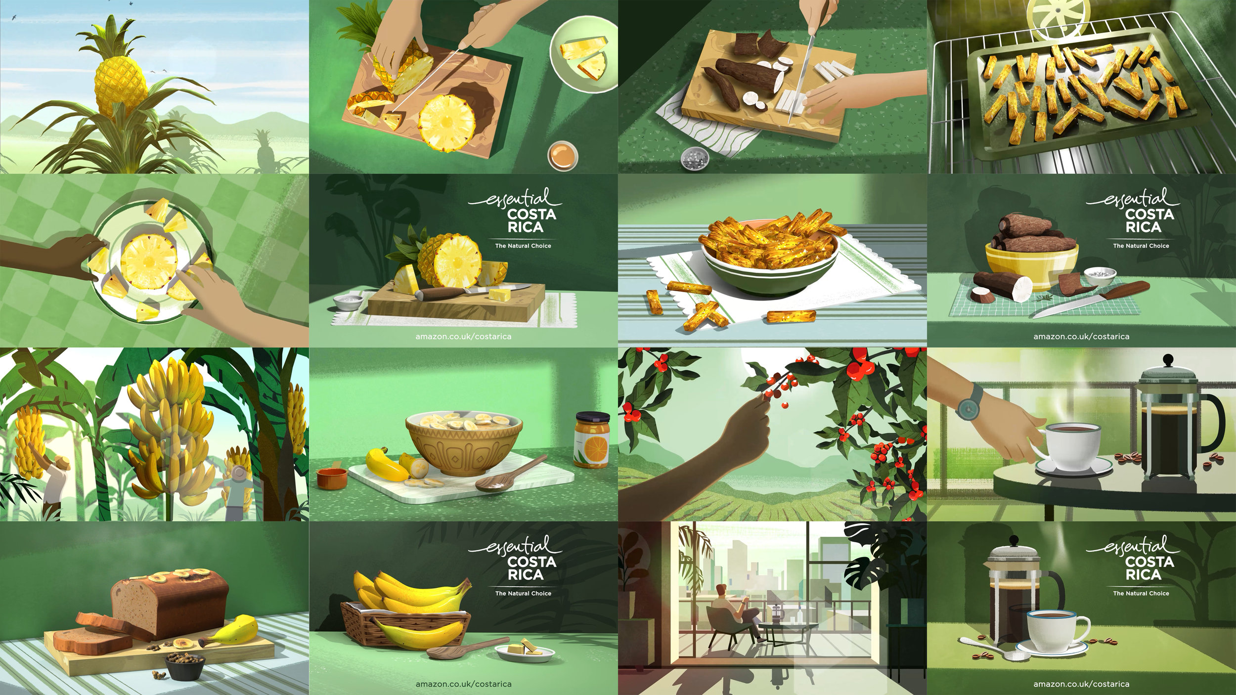 I worked with animator Jamie Slimmon and the creative team at Amazon UK on a campaign to help Essential Costa Rica find new markets for fresh produce in the UK and Europe. The campaign includes 4 x 15s TV spots in English, German and Spanish, a panoramic screen for Amazon Fire TV and large format illustrations for display on Amazon locker boxes.