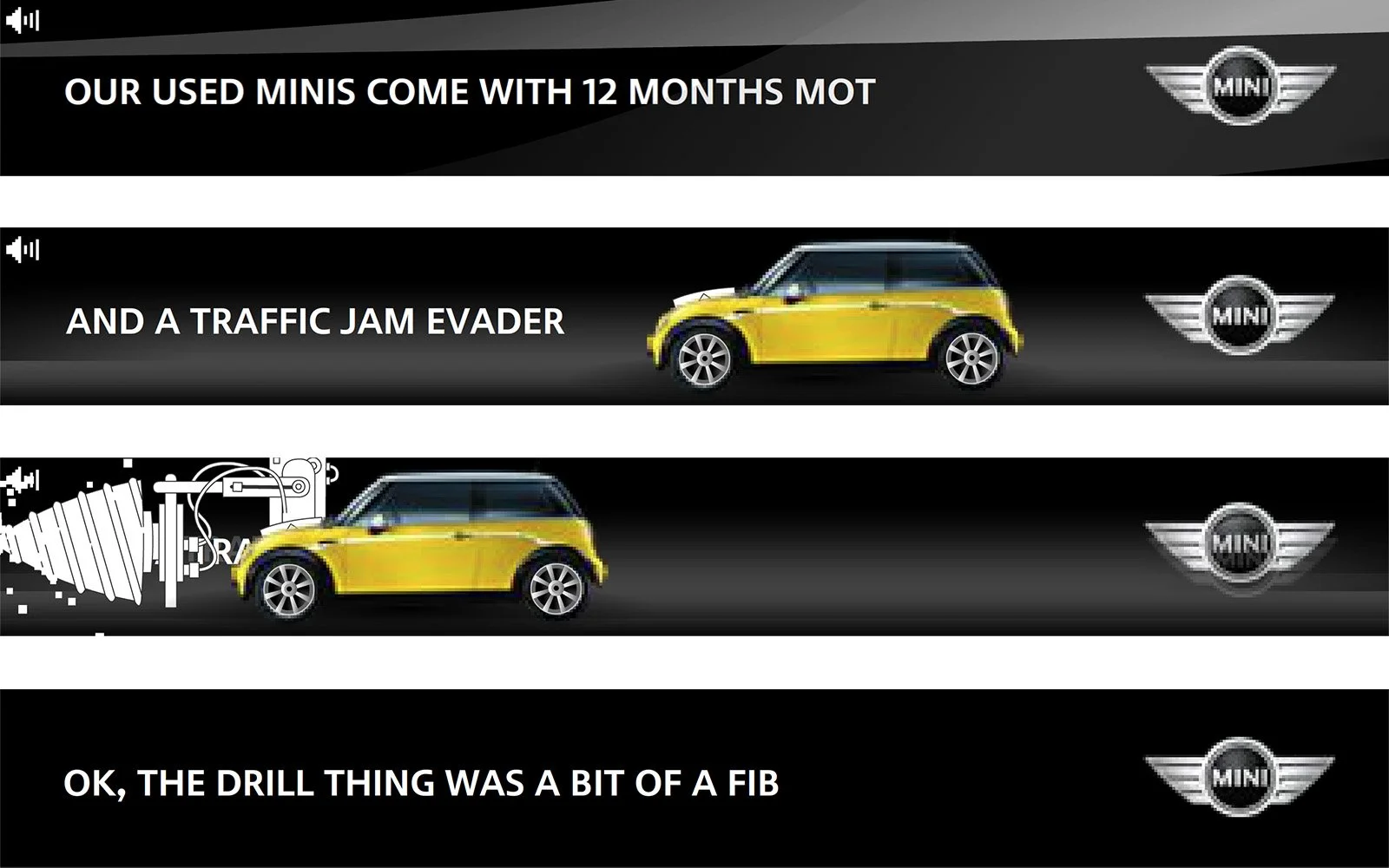 These seemingly straightforward ads showcase several extras that come with an approved used Mini. The final feature mentioned however is an outright fib. Once this is confessed, the equipment quickly folds away back into the car.